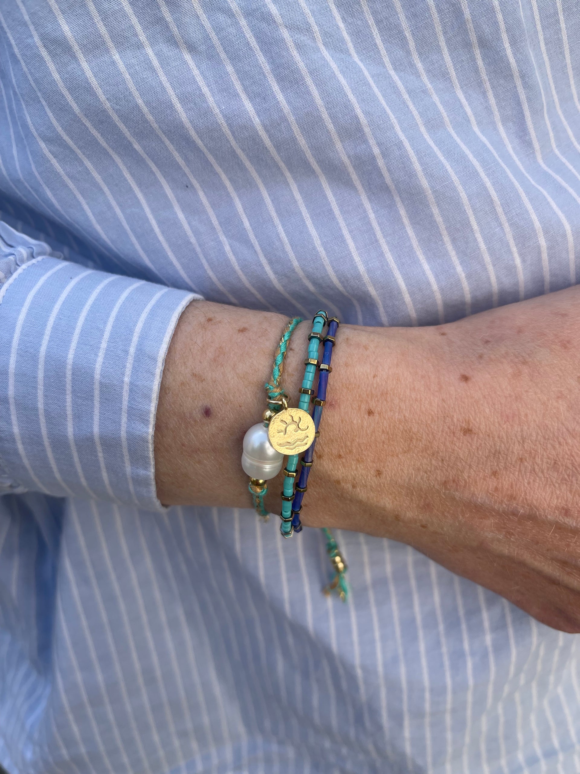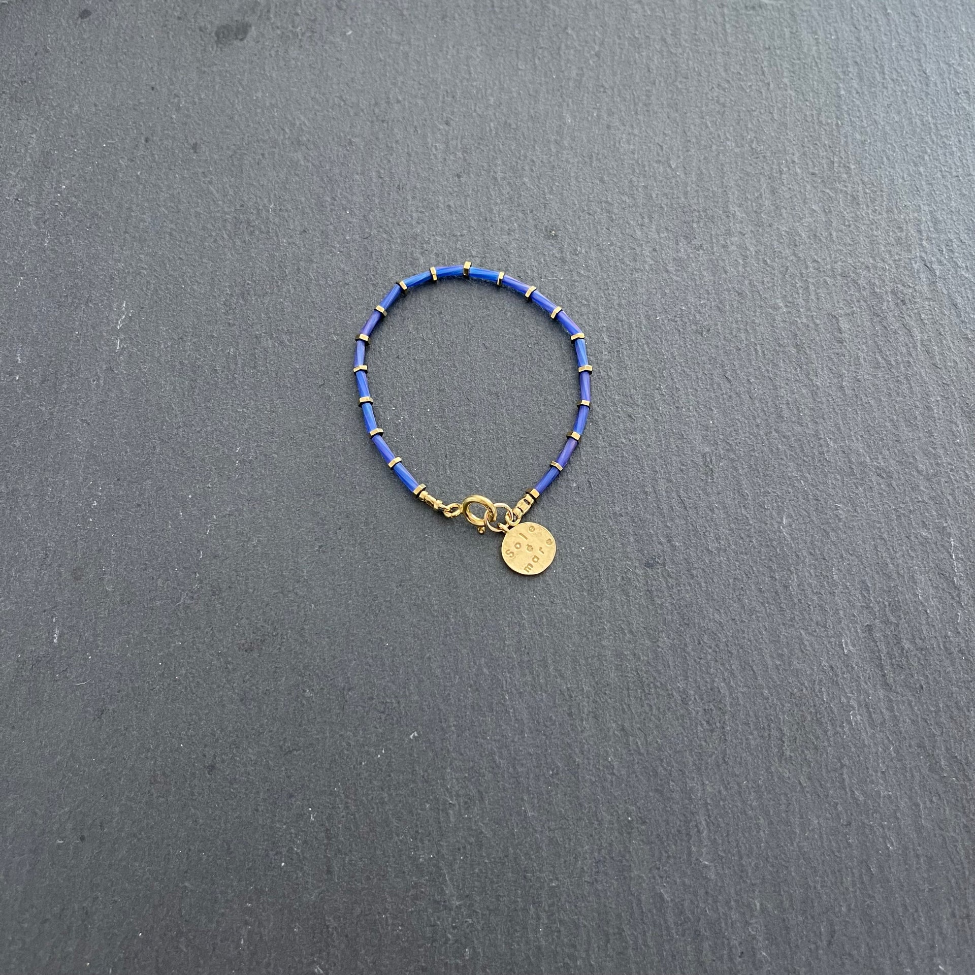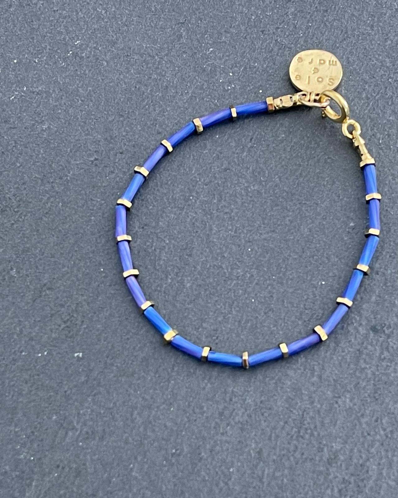 צמיד קליל ועדין במראה יוקרתי במיוחד בצבעי זהב וכחול רויאל. בהשראת חופי פאלמה בספרד. מושלם לבדו או בשילוב עם צמידים נוספים.