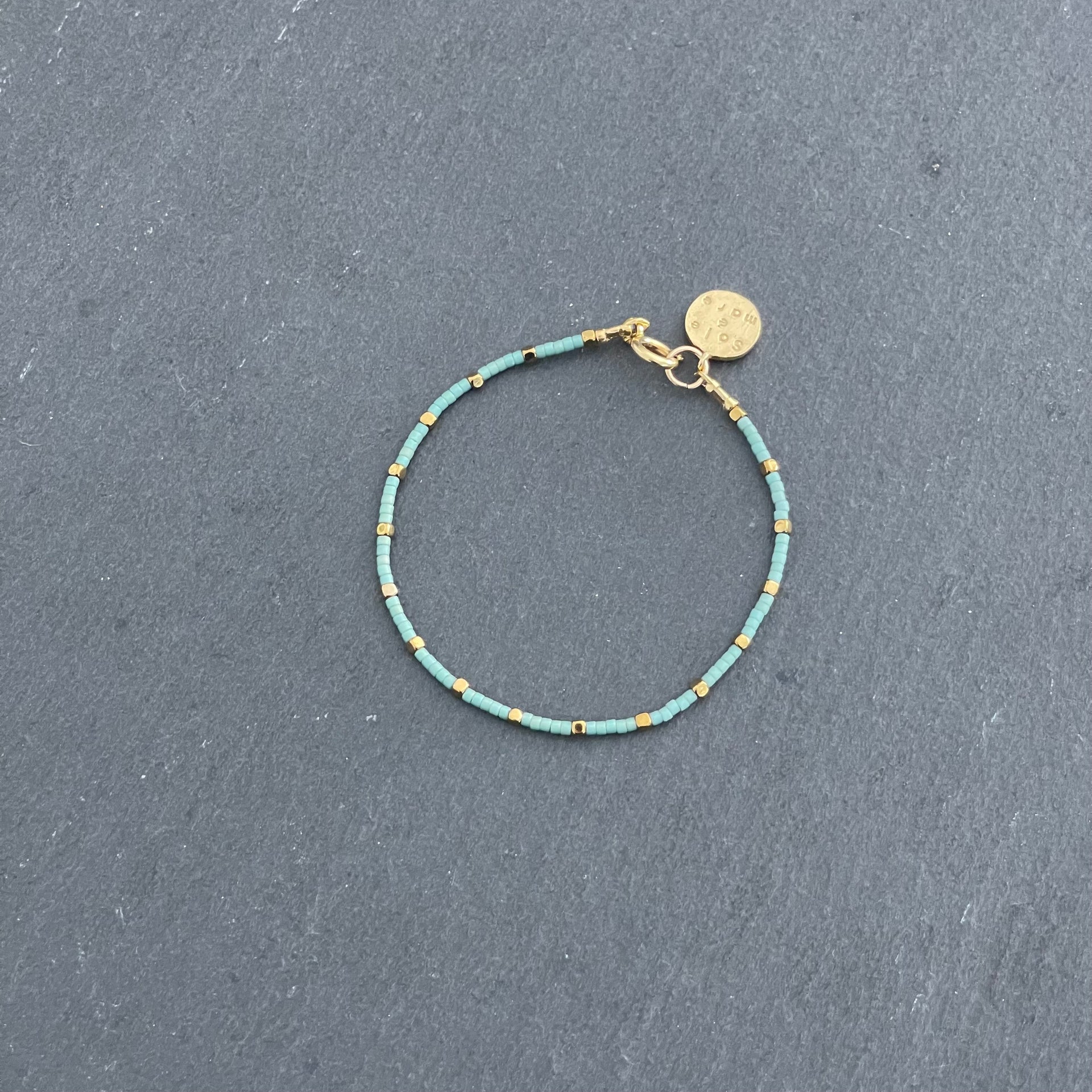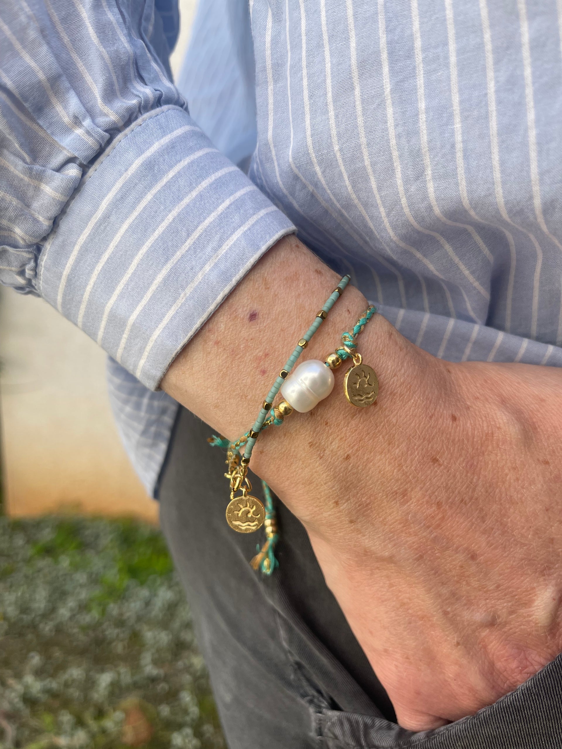 מיוצר בעבודת יד מכסף 925 בציפוי זהב מיקרוני היפואלרגני עמיד ואיכותי וחרוזים יפנים בצבע תכלת ים.