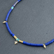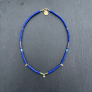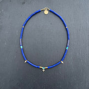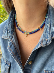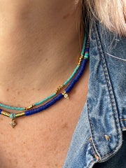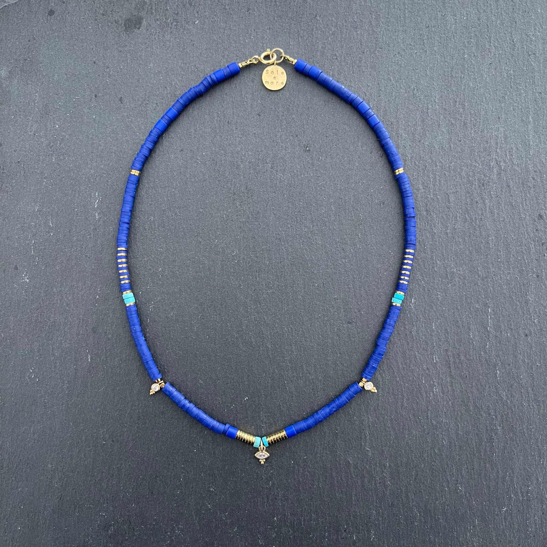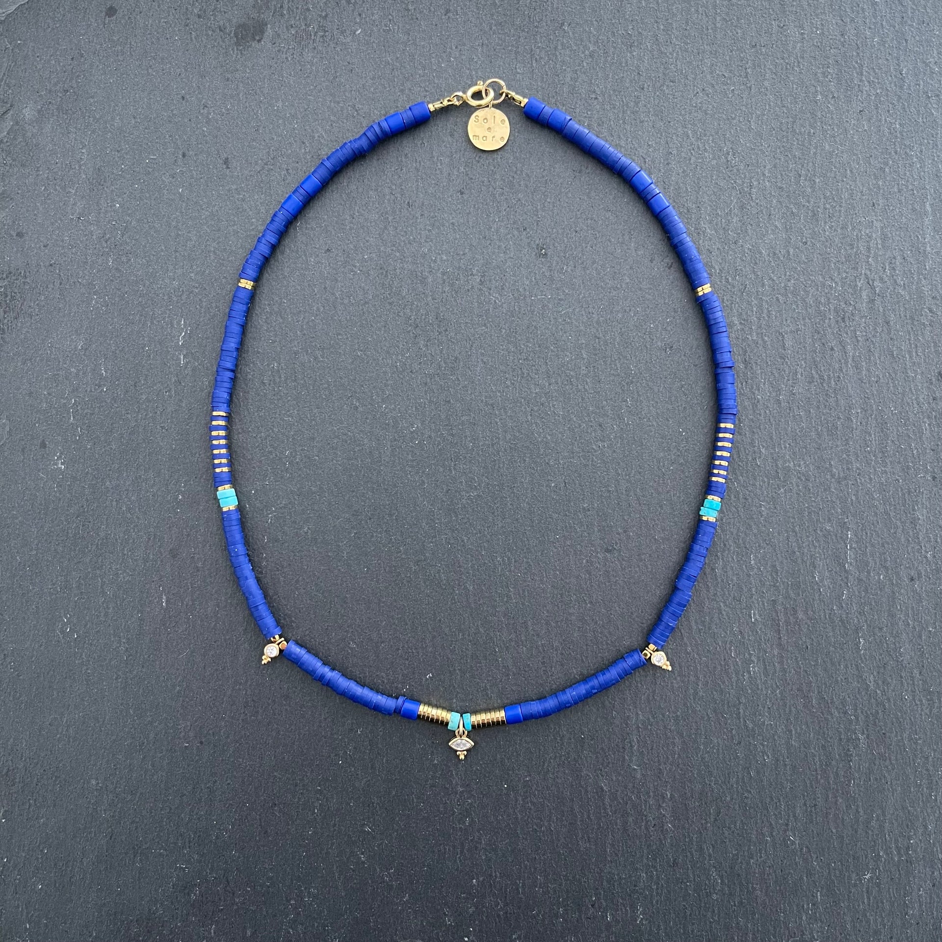 שרשרת קלילה ועדינה במראה יוקרתי במיוחד בצבעי זהב, כחול עם נגיעות טורקיז ותליונים עם זרקונים. בהשראת חופי טנריף המשגעים.